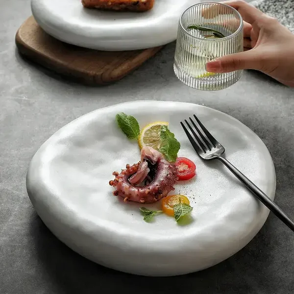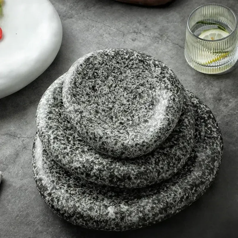 Discover the Terrastone Collection—irregular ceramic plates and bowls with a modern Japanese design. Perfect for main courses, desserts, steak, and more. • Irregular ceramic design with a handcrafted, stoneware-inspired look • Versatile use with organic edges for a unique dining experience • Durable ceramic material suitable for everyday dining or restaurant settings • Elegant stone-textured finish.