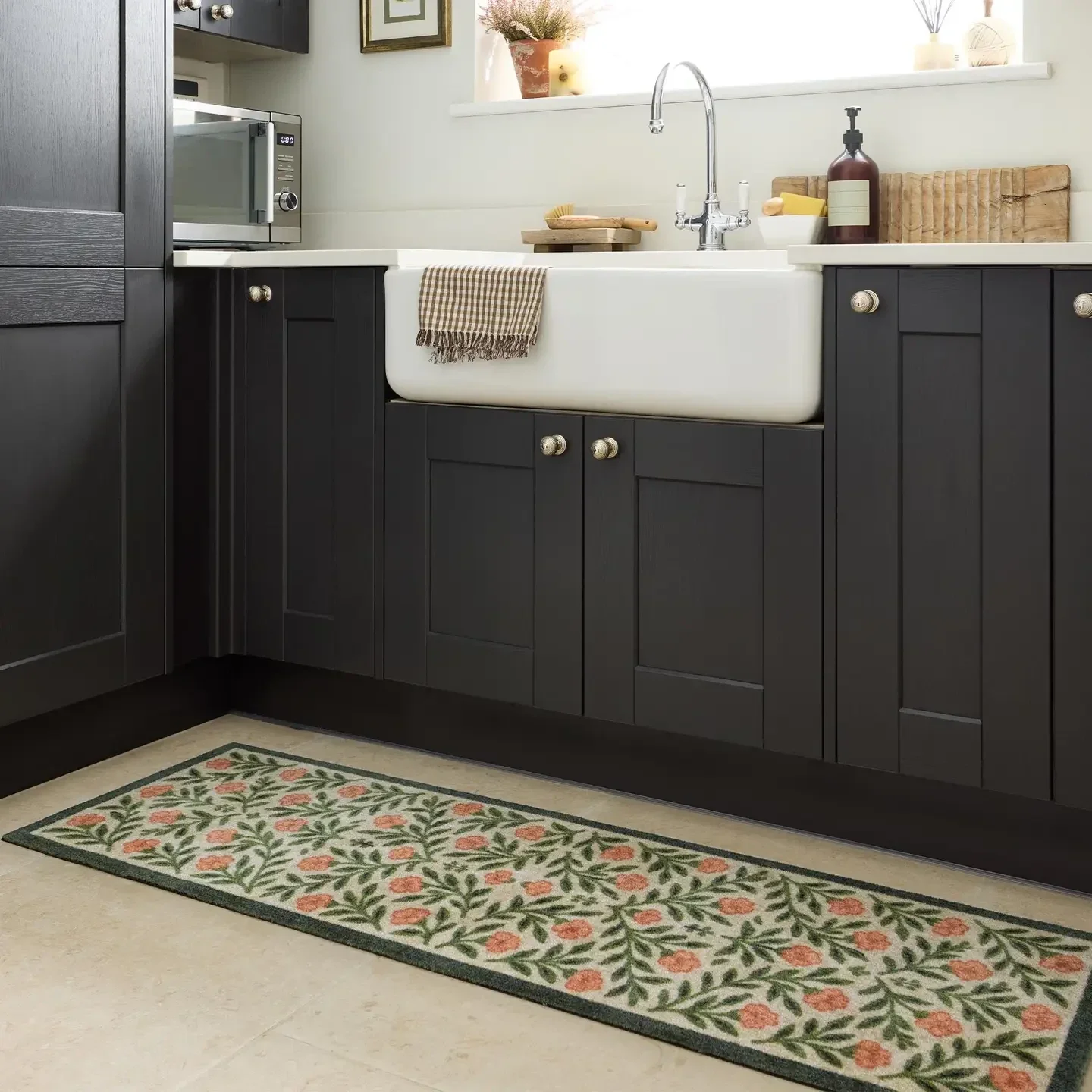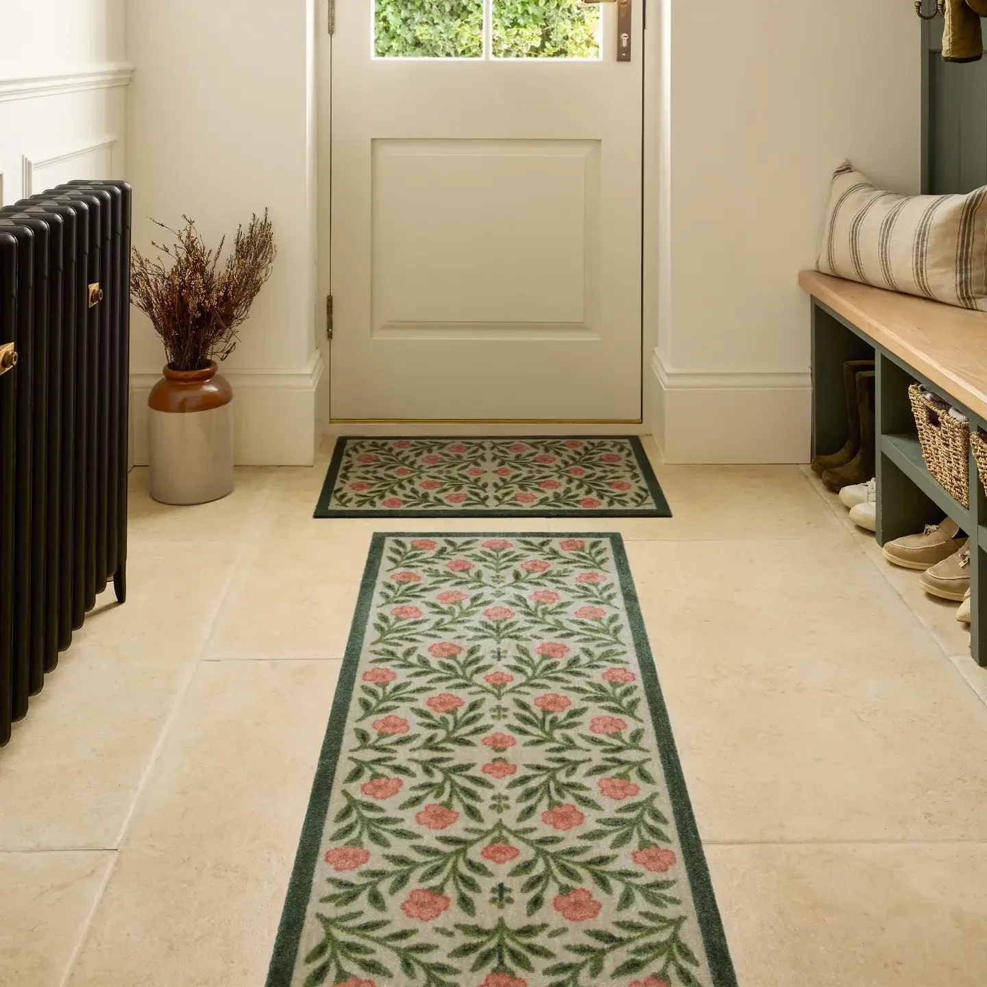 My Mat is the ideal all-purpose indoor mat, that is highly effective at keeping your floors clean. Our Pink Botanical design has a symmetrical design of small pink flowers with green stalks and leaves, on a beige background with a green border. This range of brilliant designs and sizes provides easy cleaning and drying properties. With natural stain resistance, My Mats maintain freshness after continuous washes and uses. Traps dirt, dust & mud to protect your flooring and washable at 30°C
