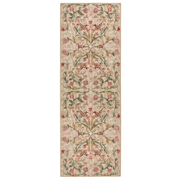 Our Heritage Garden Rug is from our British Botanicals collection, taking inspiration from our beautiful British flora and fauna. This beautiful folk inspired design is intertwining vines, florals and birds in a mirrored pattern. With a distressed look background made of shades of beige and cream, the pattern is made up of fresh greens, rusts and yellows and tones of red. Finished with beige tape. It is normal for the design to show speckles of the white from the yarn, and gives all the designs a classic, vintage look.