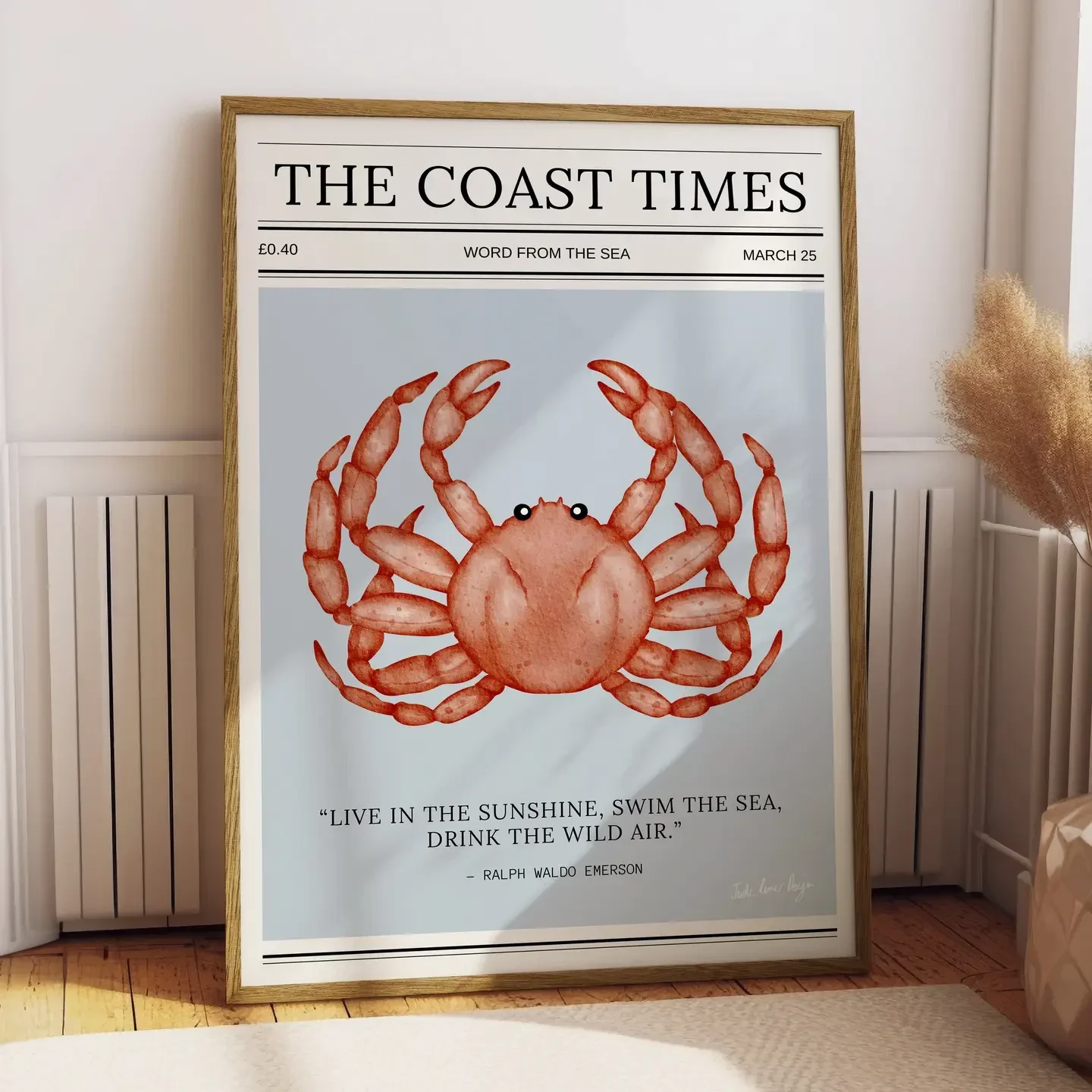 Coastal Typography Print A unique typography print by Jude River Design inspired by a newspaper front page. Featuring a watercolour painting of a crab and a beautiful quote. Printed on 316gsm 100% cotton lightly textured paper with a natural white surface. This paper ensures a classic look and feel with realism and depth.