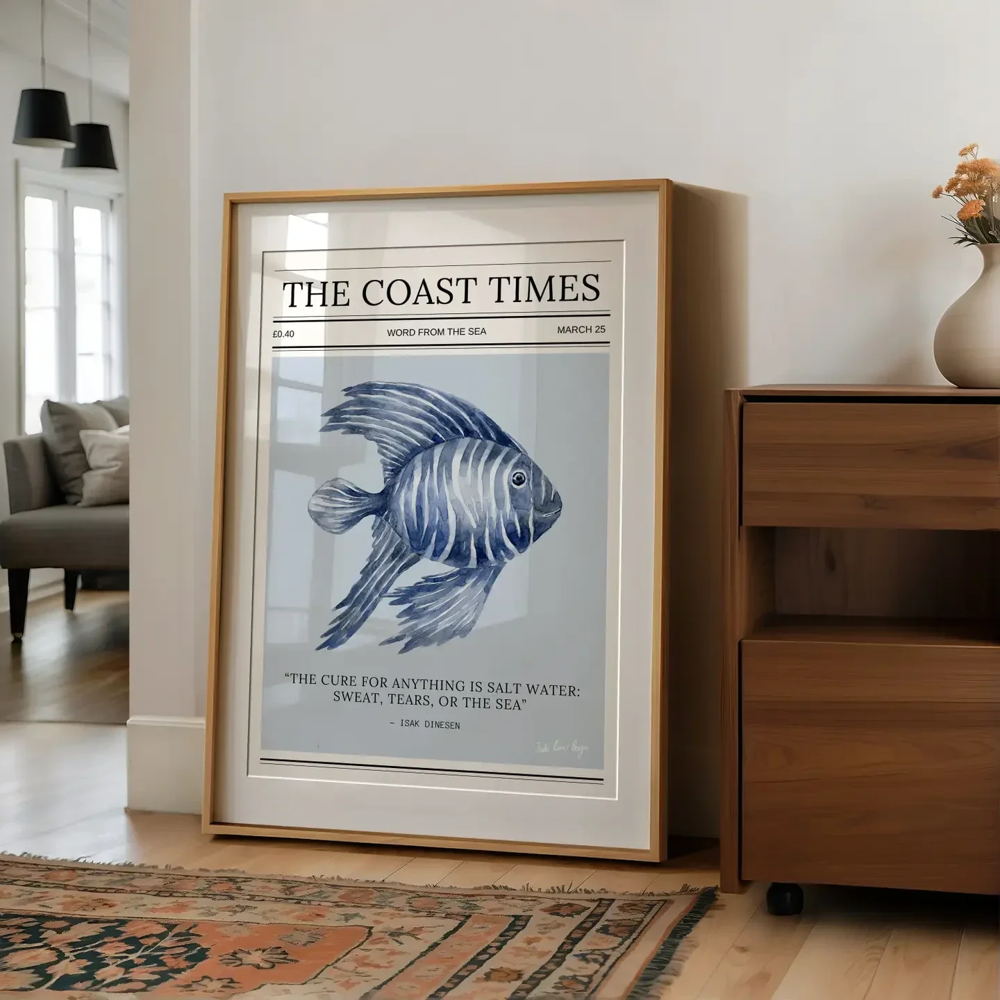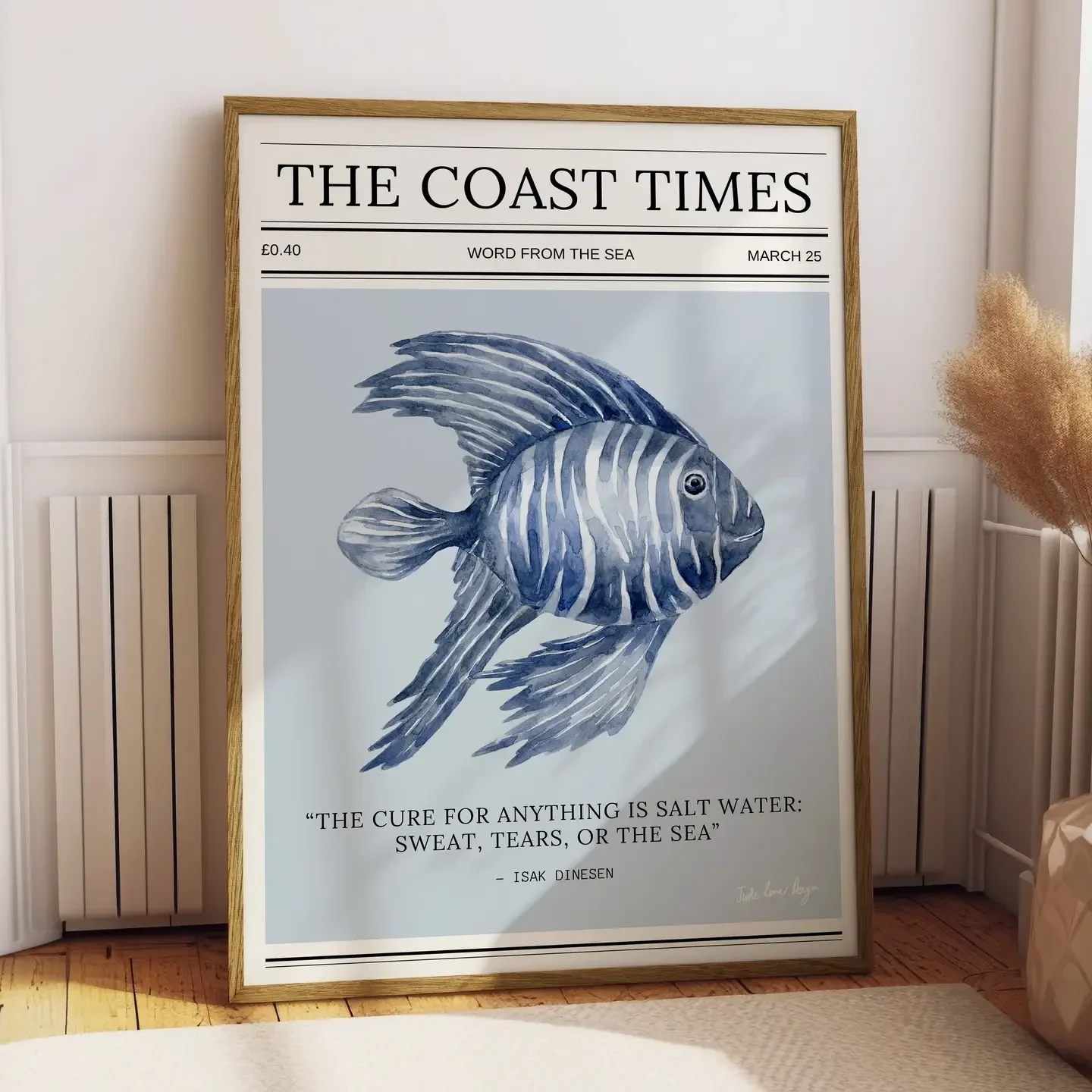 Coastal Typography Print A unique typography print by Jude River Design inspired by a newspaper front page. Featuring a watercolour painting of a fish and a nautical quote - "The cure for anything is salt water: sweat, tears, or the sea." Printed on 316gsm 100% cotton lightly textured paper with a natural white surface. This paper ensures a classic look and feel with realism and depth.