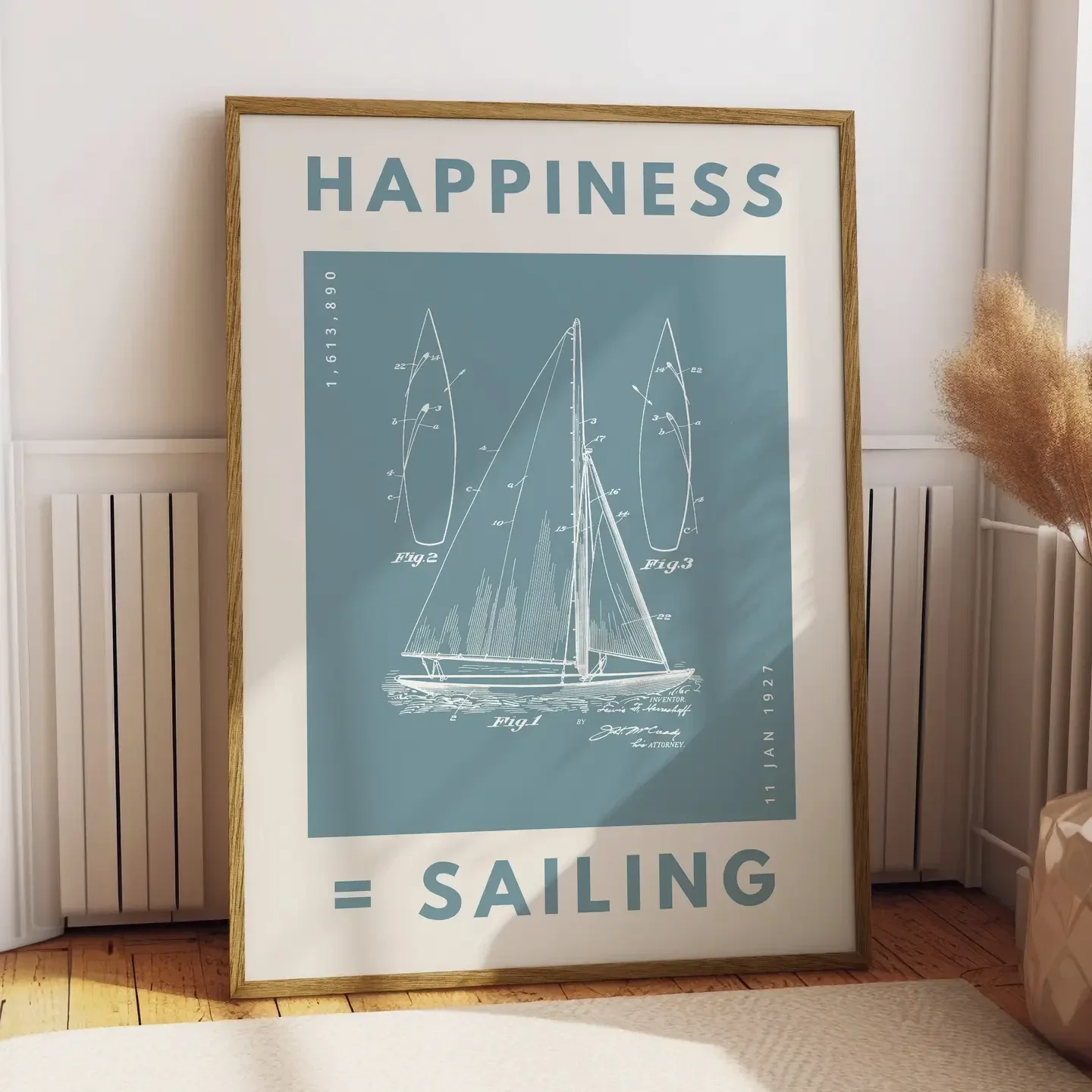 Happiness = Sailing Print: A tribute to the freedom, adventure, and timeless elegance of life at sea. This unique print features an original 1927 sailboat patent illustration by the legendary American yacht designer Herreshoff Lewis Francis, known for revolutionising naval architecture with his innovative and graceful boat designs. Perfect for sailors, sea lovers, and vintage design enthusiasts, this nautical artwork captures both the technical genius and romantic spirit of sailing. Does sailing make you happy? Printed on 316gsm 100% cotton lightly textured paper with a natural white surface. This paper ensures a classic look and feel with realism and depth.