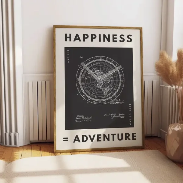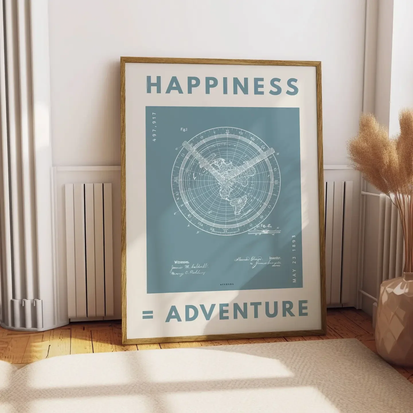 Happiness = Adventure Print Capture the spirit of adventure with this bold and inspiring print, featuring a vintage patent by Alexander Gleason who believed the earth was flat, and the words "Happiness = Adventure". The perfect motivational reminder for your walls, and home. Printed on 316gsm 100% cotton lightly textured paper with a natural white surface. This paper ensures a classic look and feel with realism and depth.