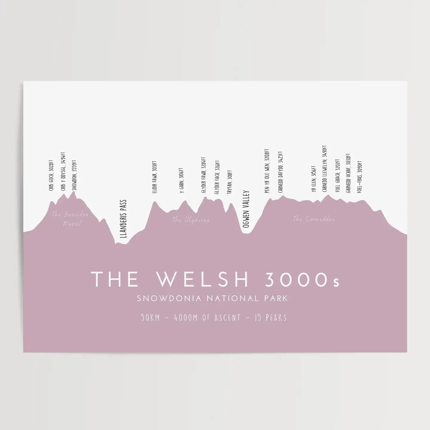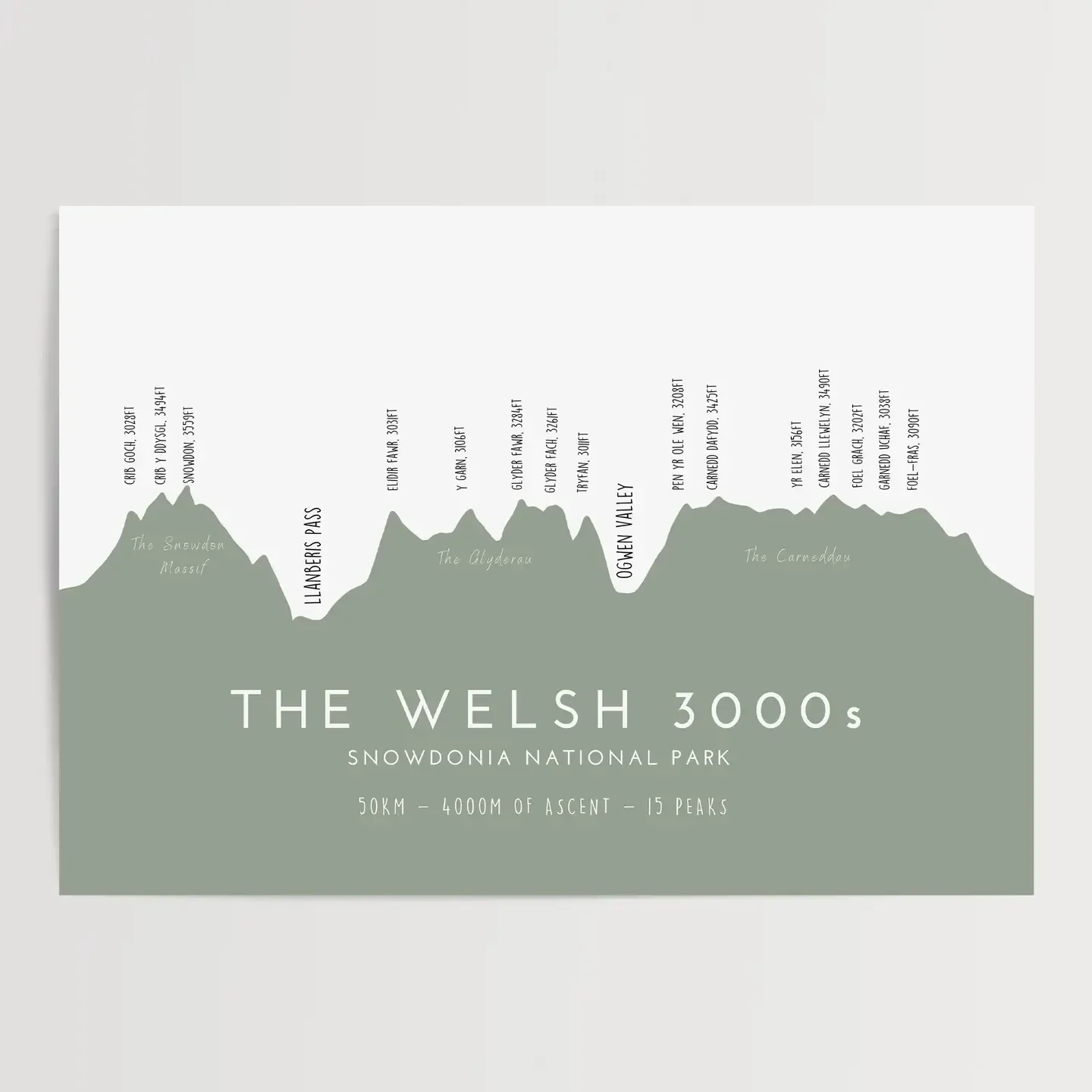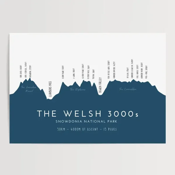 The Welsh 3000 Challenge: The Welsh 3000s are the 15 mountains in Wales with a height over 3,000 feet (914.4 m). Geographically they fall within three ranges, but close enough to make it possible to reach all 15 summits within 24 hours, a challenge known as the Welsh 3000s challenge. This print features the skyline of these 15 peaks, highlighting the three different ranges you pass - The Snowdon Massif, The Glyderau & The Carneddau. *This version is in English, I also have a Welsh version depending on your preference. See separate listing. Printed on a 316gsm 100% cotton rag textured paper with a natural white surface. This paper ensures a classic look and feel with realism and depth.